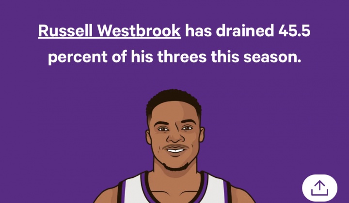 本賽季前五場比賽,威斯布魯克在三分線外的表現(xiàn)起伏明顯,他時常在高效與三不沾之間切換: