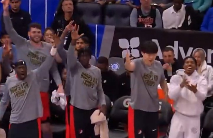 首節(jié)比賽,開拓者中鋒羅伯特·威廉姆斯飚中生涯第二記三分,楊瀚森與替補席的隊友們開心慶祝。