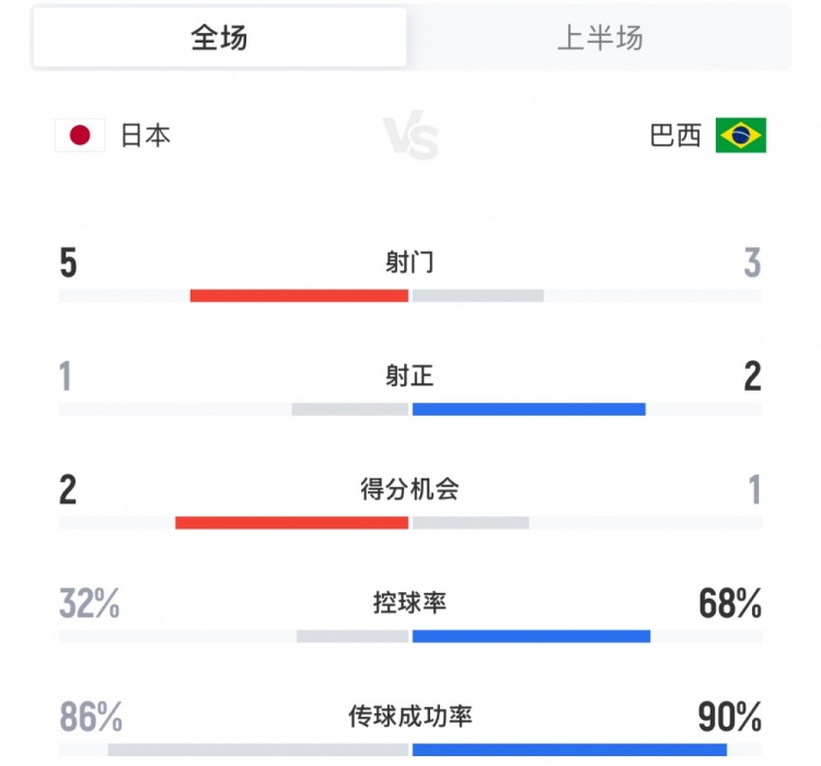 日本vs巴西半場數(shù)據(jù)對比(主隊(duì)日本隊(duì)在前)