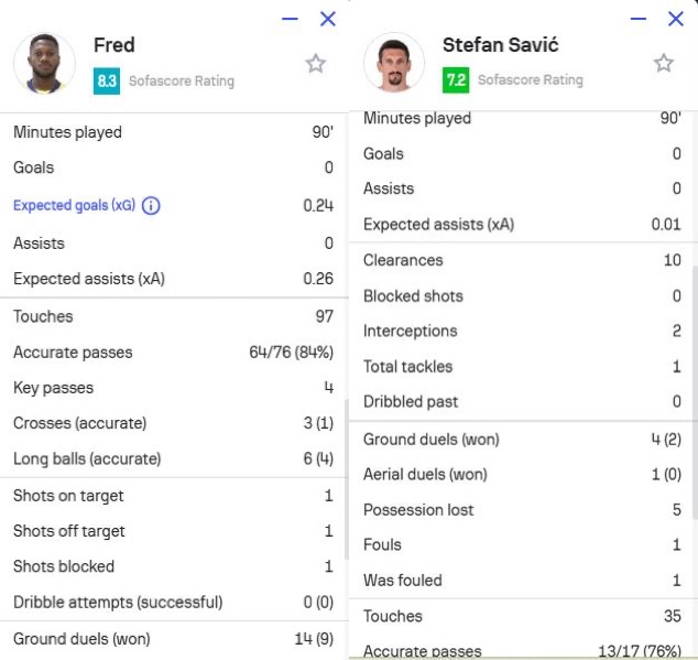 此外,曼聯(lián)舊將弗雷德(費(fèi)內(nèi)巴切)和曼城舊將薩維奇(特拉布宗體育)也都在本場比賽打滿全場,弗雷德還獲評(píng)8.3分全場第二高。