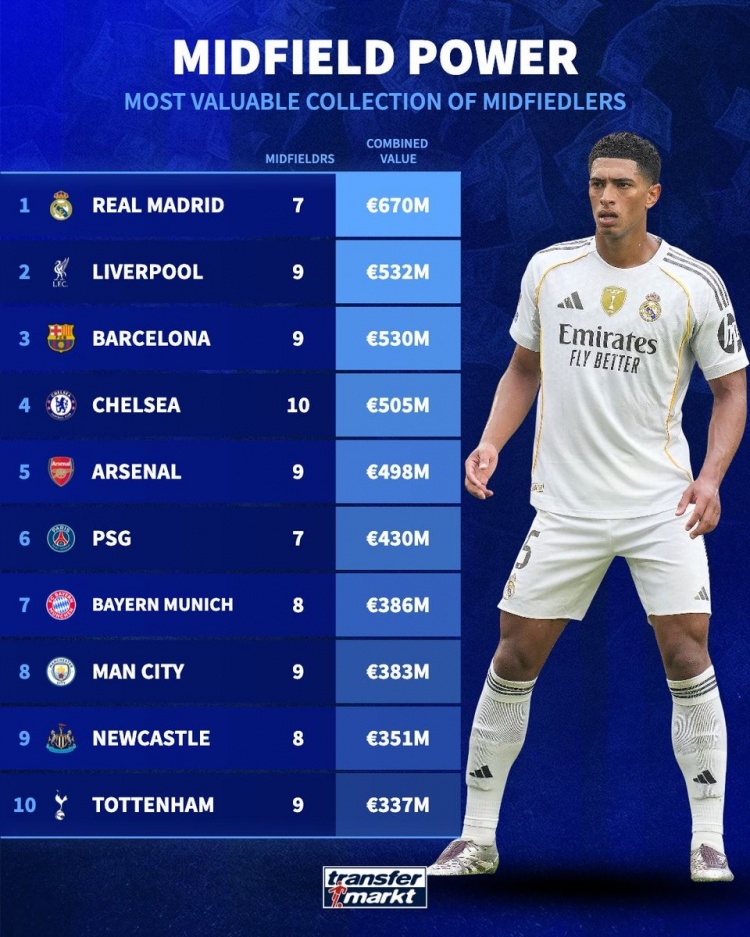9月25日訊 日前,德轉統(tǒng)計了各隊中場球員總身價排行,皇馬7名中場總價6.7億歐居首。
