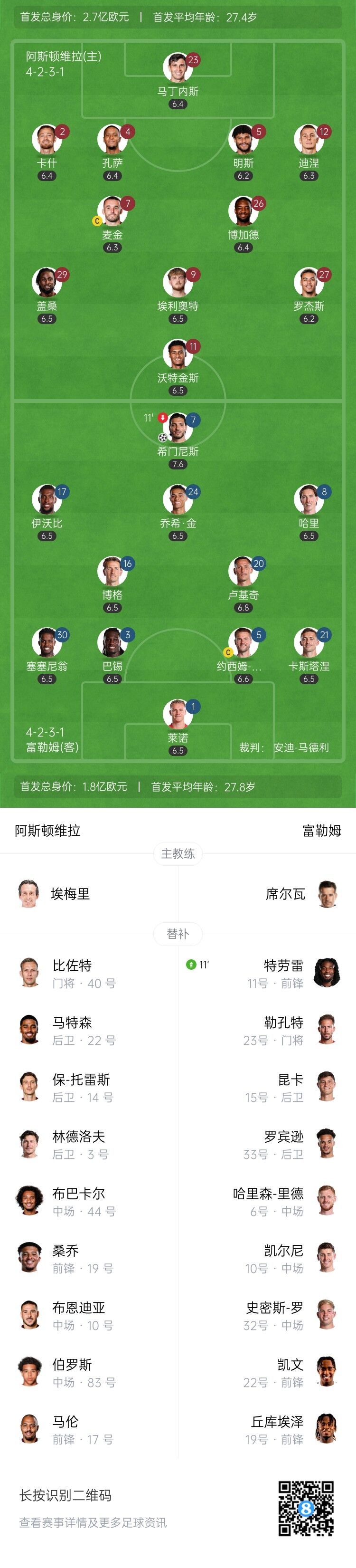 傷停補時2分鐘。上半場比賽結束,阿斯頓維拉1-1富勒姆。