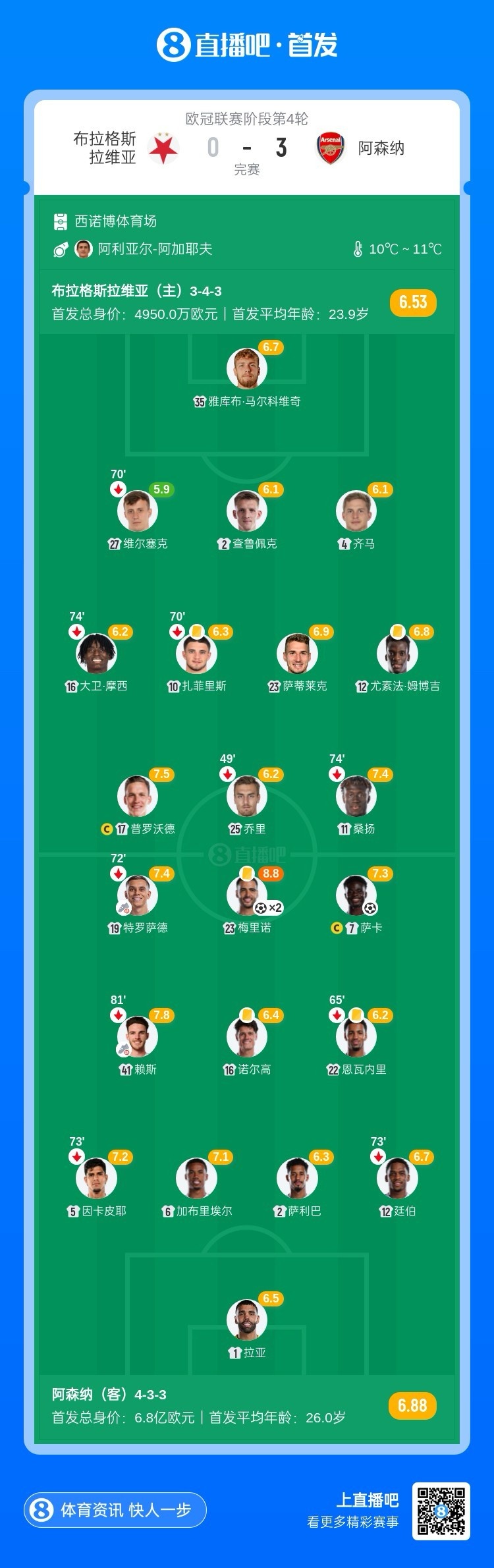 11月5日訊 北京時(shí)間11月5日凌晨1時(shí)45分,歐冠聯(lián)賽階段第4輪,阿森納做客西諾博體育場(chǎng)對(duì)陣布拉格斯拉維亞。上半場(chǎng),普羅沃德手球犯規(guī)送點(diǎn),薩卡點(diǎn)射首開(kāi)紀(jì)錄。阿森納半場(chǎng)1-0領(lǐng)先布拉格斯拉維亞。下半場(chǎng),梅里諾打進(jìn)兩球,15歲零308天的道曼替補(bǔ)登場(chǎng),成為歐冠有史以來(lái)最年輕登場(chǎng)球員。最終阿森納3-0擊敗布拉格斯拉維亞,各項(xiàng)賽事取得十連勝+歐冠4輪全勝,連續(xù)8場(chǎng)零封對(duì)手!