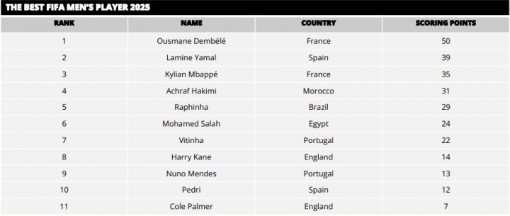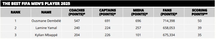 12月17日訊 FIFA年度頒獎(jiǎng)典禮結(jié)束,登貝萊當(dāng)選年度最佳球員(世界足球先生),F(xiàn)IFA官方公布了得票情況。