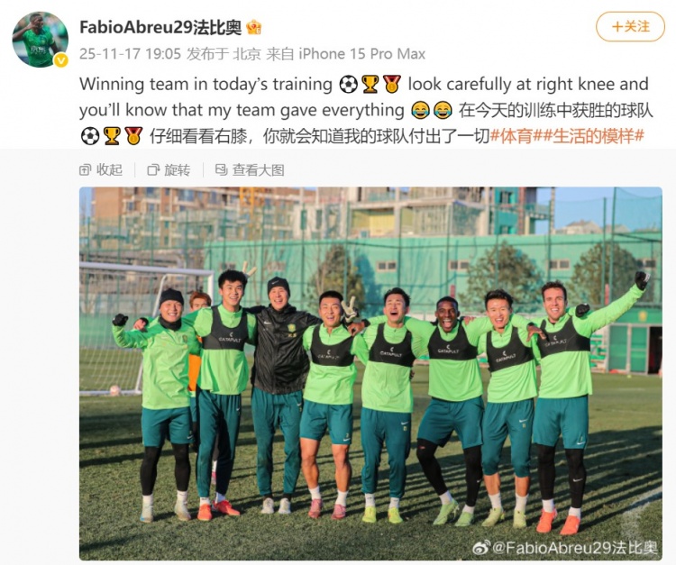 11月17日訊 國安球員法比奧更新社媒,他的團隊在隊內(nèi)對抗獲勝。