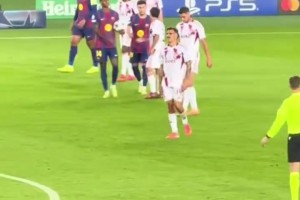 很體貼 拉師傅賽后將比賽用球扔給戴帽的費(fèi)爾明
